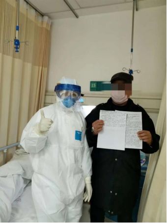 43床的患者,從我們醫(yī)療隊(duì)進(jìn)駐開(kāi)始,他就是重點(diǎn)觀察對(duì)象,我眼看他從病重到病危再到有所好轉(zhuǎn)。前一段時(shí)間,他的病情又突然惡化,他卻依然頑強(qiáng)地與病魔搏斗,甚至采取俯臥位通氣的方式也要堅(jiān)持下去。我有時(shí)也想,如果換作是我,也許沒(méi)有這么堅(jiān)強(qiáng)的毅力撐這么久。他甚至已經(jīng)寫(xiě)下了遺書(shū),歪斜的字體能勉強(qiáng)認(rèn)出:“我的遺體捐國(guó)家。”我瞬時(shí)淚目。他還多次拒絕過(guò)服藥,他說(shuō)留給需要的人吧。醫(yī)療團(tuán)隊(duì)當(dāng)然不放棄希望,不停地聯(lián)系床位和協(xié)調(diào)120,終于等來(lái)了好消息:金銀潭有了一個(gè)床位,可120的設(shè)備卻還沒(méi)有到位。沒(méi)有無(wú)創(chuàng)呼吸機(jī),我們就用自己的!沒(méi)有氧氣筒,我們自己扛下去,一個(gè)不行,我們扛兩個(gè)!就這樣,患者終于安全順利地抵達(dá)了金銀潭醫(yī)院!還記得那天下班,到達(dá)酒店房間,我一屁股坐在行李箱上,突然間就淚流滿面。