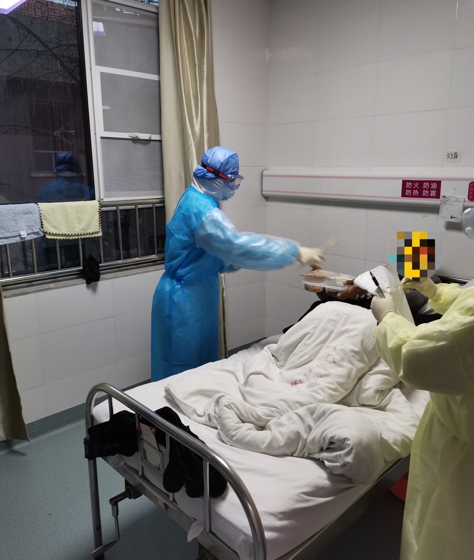 這個病在當時對所有人來說都是個謎,因此很多住院病人會產(chǎn)生焦慮而吃不下東西,這其實會大大降低他們的免疫力,并不利于他們的康復。于是,我們就不斷的開導安慰他們,讓他們配合去吃東西,有的病人口頭上敷衍著答應(yīng)但依舊不吃,我們就守在他們身邊,看著他把東西吃完,然后再把飯盒收走。