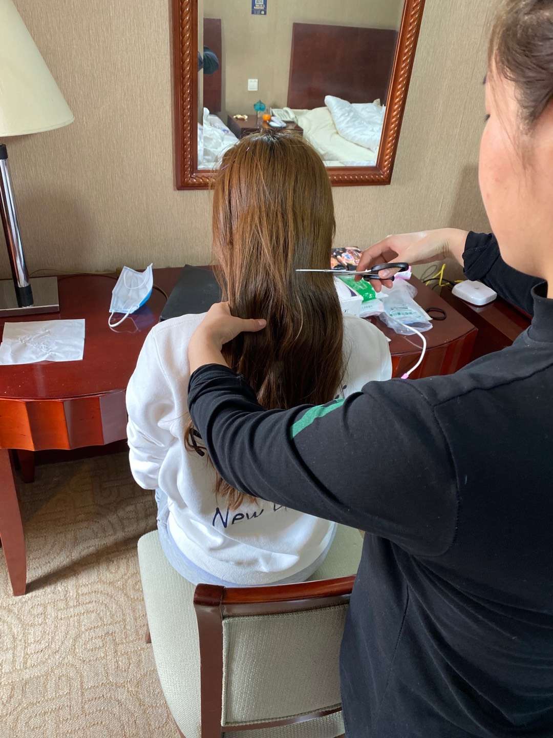 張霜:剪頭發(fā)完全是我個人自愿的行為,是來到武漢之后的第三天,我們幾個護士同事一起在宿舍里互相給剪的。我的頭發(fā)很長,留了十幾年都能到腰部了,這讓我在穿防護服,包括帶口罩、護目鏡、戴帽子的時候都很不舒服,頭發(fā)太多會頂?shù)矫弊雍皖i部,有的時候碎頭發(fā)還會包不住“跑出”防護服,這就增加了被感染的風險。同時,頭發(fā)長了,每次都要洗很長時間,也非常浪費時間。所以即便是舍不得剪掉,為了安全和方便,也不得不剪掉。