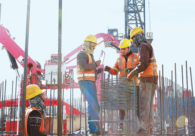 圖為埃及新首都中央商務(wù)區(qū)“標(biāo)志塔”工程施工現(xiàn)場(chǎng),中埃兩國(guó)項(xiàng)目員工共同綁扎鋼筋。