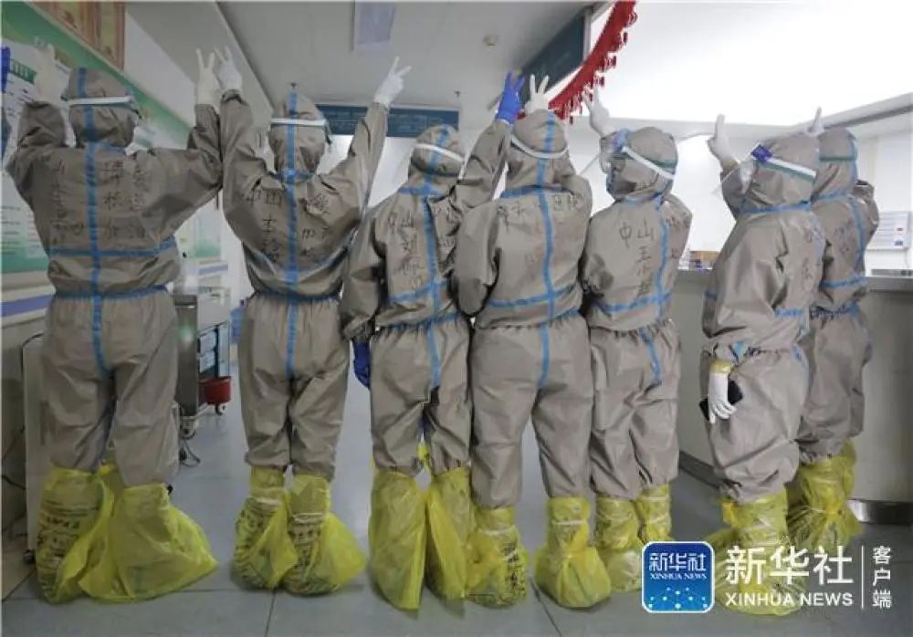 ↑派遣至松滋市人民醫(yī)院工作的廣東醫(yī)療隊隊員在防護服上寫下自己名字