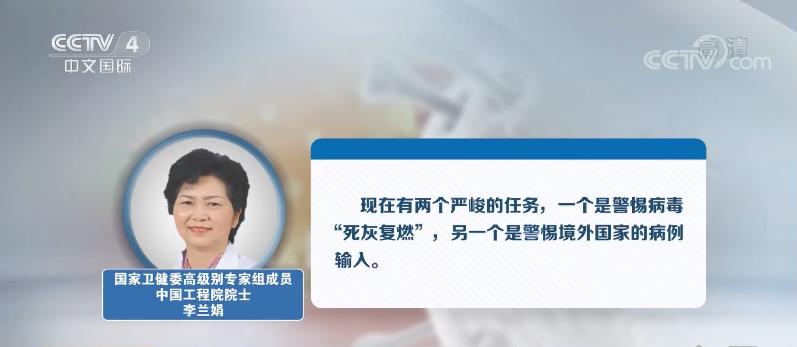 李蘭娟表示,現(xiàn)在有兩個(gè)嚴(yán)峻的任務(wù),一個(gè)是警惕病毒“死灰復(fù)燃”,另一個(gè)是警惕境外國家的病例輸入。