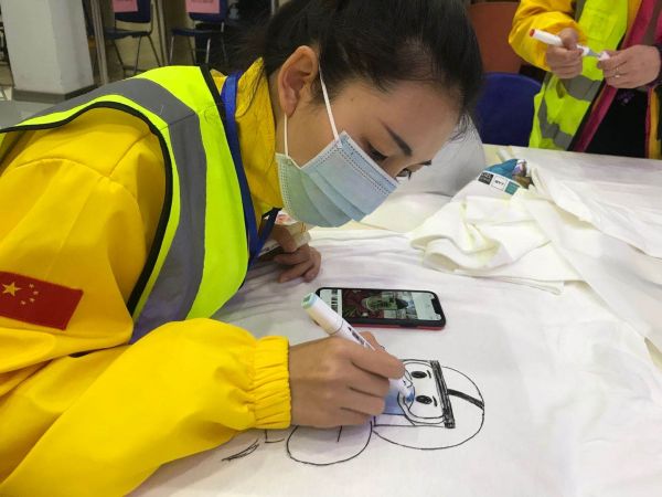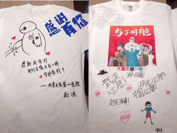 武漢志愿者在T恤上,為醫(yī)護(hù)人員涂鴉 徐敬陽(yáng) 供圖