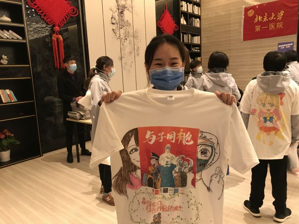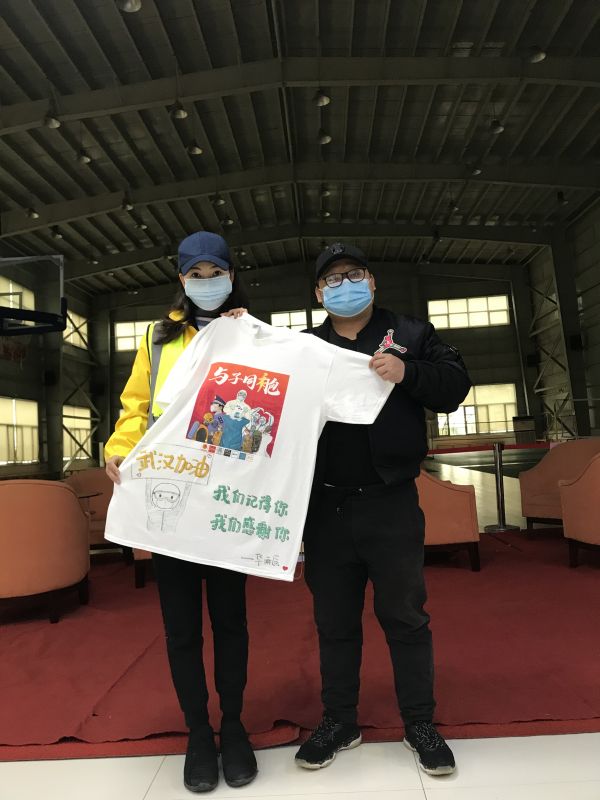 徐敬陽(yáng)介紹,他給每位醫(yī)護(hù)人員準(zhǔn)備了兩件文化衫,正面都印有專門設(shè)計(jì)的“與子同袍”的字樣和醫(yī)護(hù)等戰(zhàn)“疫”一線人物群像圖案,“一件可以經(jīng)常穿,另一件因?yàn)橛型盔f,不能洗,可以留作紀(jì)念!