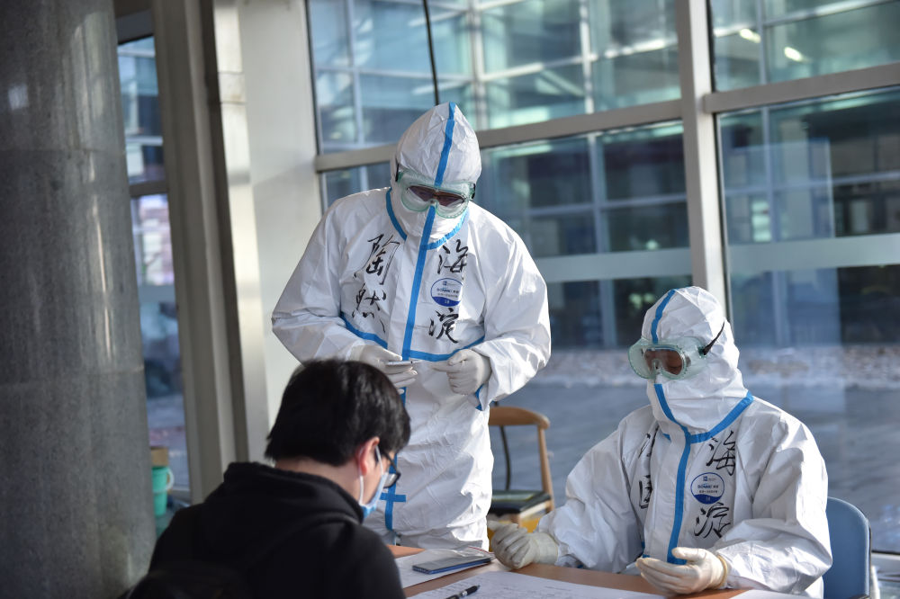 3月14日,北京市海淀區(qū)集散點工作人員在詢問入境人員信息。近日,北京市啟用新國展作為首都機場全部國際及港澳臺地區(qū)入境旅客的轉(zhuǎn)運集散地,此集散地用于經(jīng)機場檢疫后未出現(xiàn)發(fā)熱、咳嗽等癥狀的低風險人群臨時集散。新華社發(fā)(陳鐘昊攝)