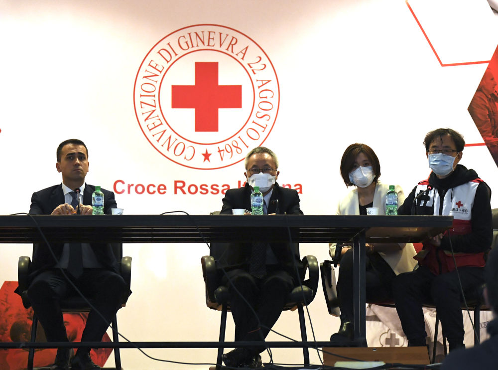 3月13日,在意大利首都羅馬,意大利外長迪馬約(左一)與中國抗疫醫(yī)療專家組成員(右一)出席新聞發(fā)布會。 新華社發(fā)(阿爾貝托·林格利亞攝)