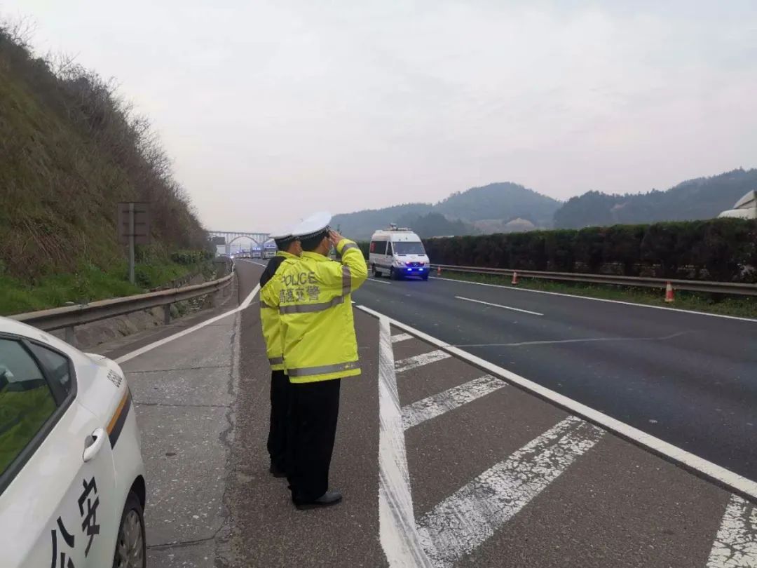 在寧夏緊急醫(yī)學(xué)救援隊(duì)車輛返回沿途,湖北省高速交警警車護(hù)航,民警列隊(duì)敬禮,車輛鳴笛致意。