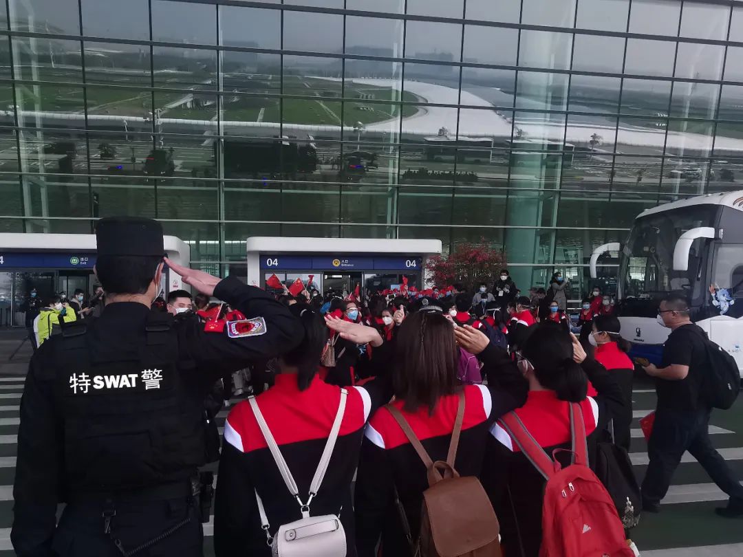 執(zhí)勤特警向離漢醫(yī)療隊(duì)敬禮致意