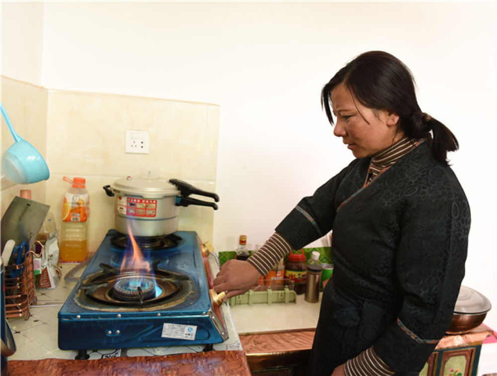在西藏山南市貢嘎縣森布日安置點(diǎn),次仁卓嘎做飯第一次用上了燃?xì)庠睿?月12日攝)。新華社記者 田金文 攝