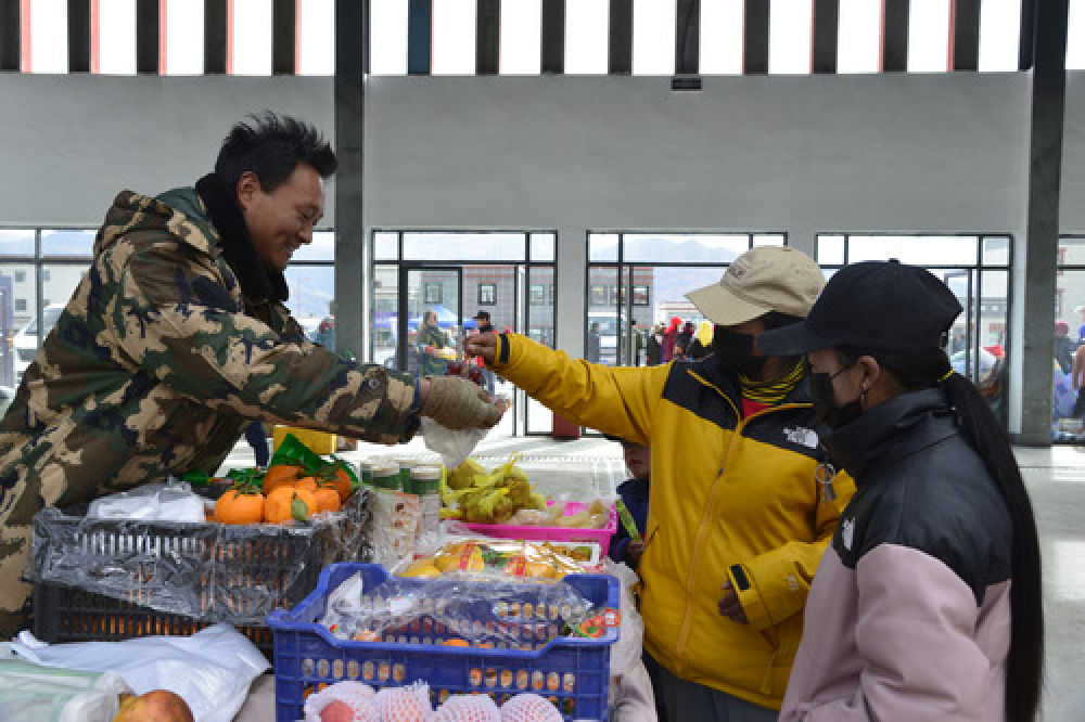 在西藏山南市貢嘎縣森布日安置點(diǎn)的農(nóng)貿(mào)市場里,新居民在買水果(1月12日攝)。新華社記者 田金文 攝