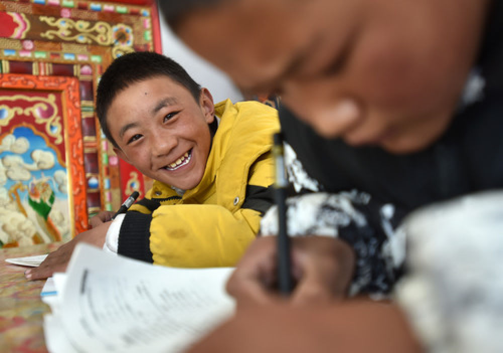 在西藏山南市貢嘎縣森布日安置點(diǎn),14歲的貢覺加錯(cuò)在新家復(fù)習(xí)功課(1月20日攝)。 新華社記者 覺果 攝