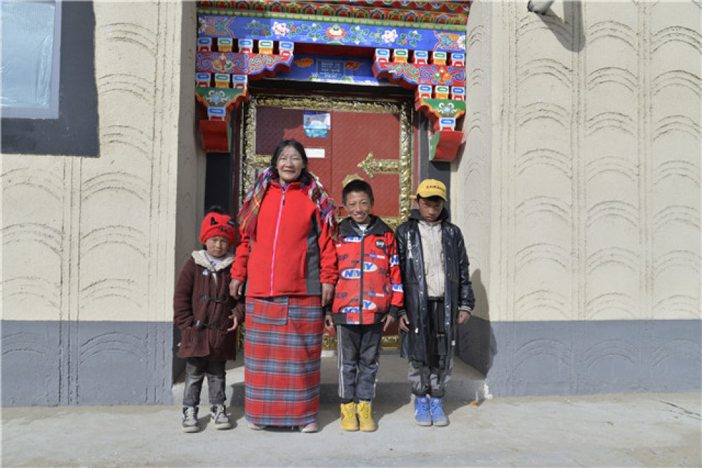在西藏山南市貢嘎縣森布日安置點(diǎn),扎西的媽媽和扎西的孩子們?cè)谛录议T前留影(1月12日攝)。新華社記者 田金文 攝