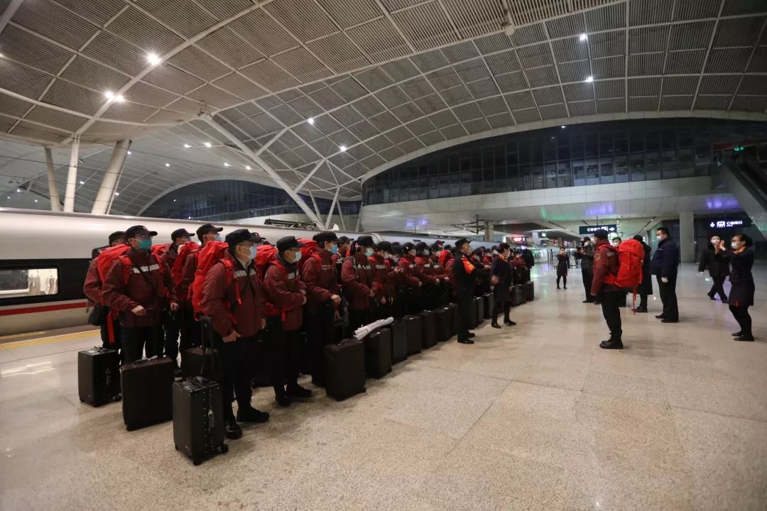 廣東省第二人民醫(yī)院國際應急醫(yī)療隊57名隊員在廣州火車南站搭乘高鐵到達武漢