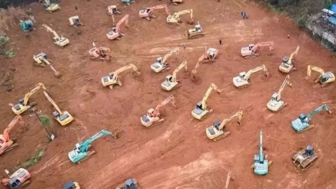 1月24日除夕 第1天 上百臺挖機抵達火神山醫(yī)院現(xiàn)場,開始土地平整