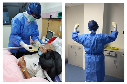 記得剛開始穿防護服進病房,小伙伴們緊張害怕,緊張自己的防護服是否嚴密包裹自己,是否有任何暴露的風險。害怕的是,因為是第一次接收病人,能否合理安排好工作秩序,能否可以和病人順利交流等諸多問題。隨著時間的推移,在摸索中一步步前進,轉眼間,一個月快過去了,我們已經(jīng)適應了穿防護服的日子,適應了每天過的跟打仗似的日子。