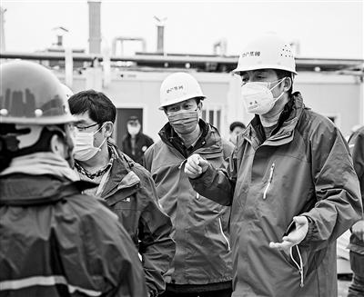 付明貴(右一)在雷神山醫(yī)院建設現(xiàn)場指揮調度。作者供圖