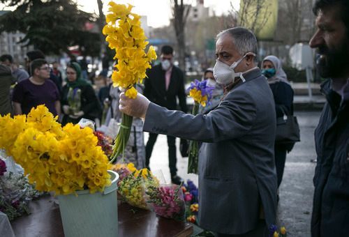 3月19日,有伊朗民眾戴著口罩在挑選鮮花,準(zhǔn)備慶祝節(jié)日。新華社發(fā)
