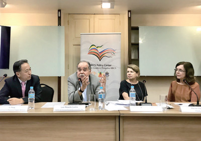 2月14日,中國駐里約熱內(nèi)盧總領(lǐng)事李楊(左一)正在巴西金磚國家政策中心舉行的“新冠肺炎疫情及其國際影響”研討會(huì)進(jìn)行情況介紹。
