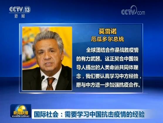 厄瓜多爾總統(tǒng)莫雷諾表示,全球團(tuán)結(jié)合作是戰(zhàn)勝疫情的有力武器。這正契合中國領(lǐng)導(dǎo)人提出的人類命運(yùn)共同體理念,我們要認(rèn)真學(xué)習(xí)中方經(jīng)驗(yàn),愿與中方進(jìn)一步加強(qiáng)抗疫合作。