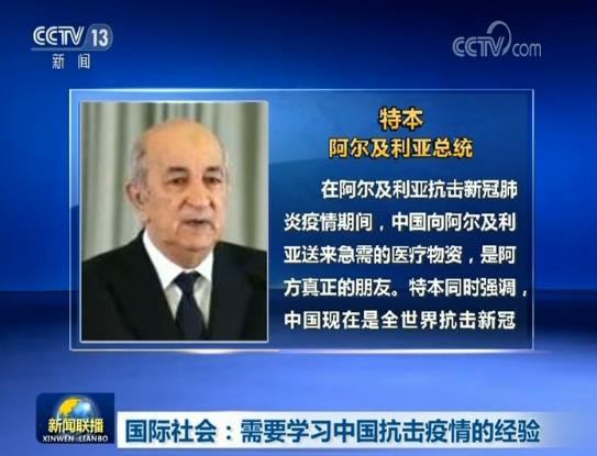 阿爾及利亞總統(tǒng)特本表示,在阿爾及利亞抗擊新冠肺炎疫情期間,中國向阿爾及利亞送來急需的醫(yī)療物資,是阿方真正的朋友。特本同時(shí)強(qiáng)調(diào),中國現(xiàn)在是全世界抗擊新冠肺炎疫情中少數(shù)有能力為其他國家提供醫(yī)療援助和支持的力量。