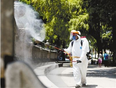 4月6日,在墨西哥首都墨西哥城,工作人員在城市主干道附近進(jìn)行消殺工作。