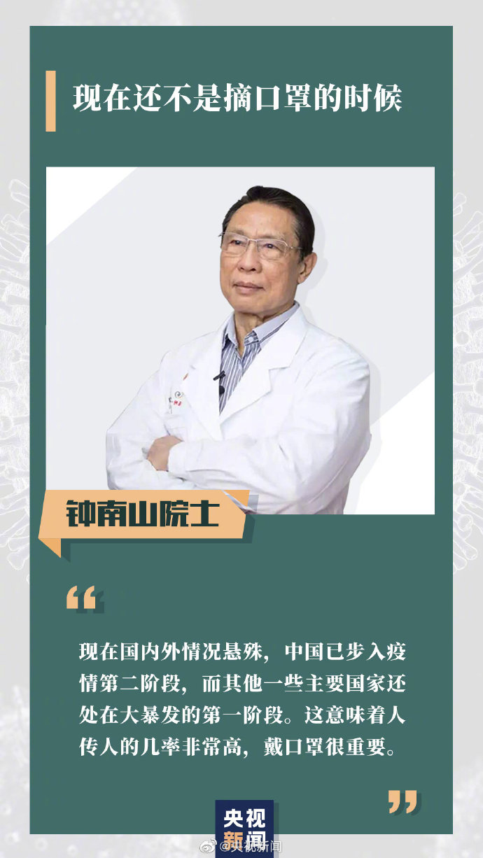 鐘南山:現(xiàn)在國內(nèi)外情況懸殊,中國由于采取了非常果斷的措施,已步入疫情第二階段,而其他一些主要國家還處在大暴發(fā)的第一階段,且仍在向上攀升。這意味著人傳人的幾率非常高,確診病例增加非?臁戴口罩仍是很重要的自我防護(hù)手段,但在疫情不嚴(yán)重的地區(qū),人少的地方或空曠場所,倒不見得必須戴。