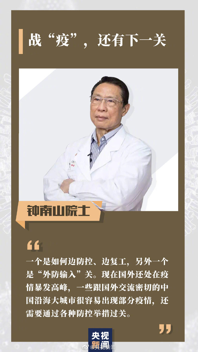 鐘南山:疫情發(fā)生后,中央果斷出手,對武漢城市交通進(jìn)行管控,其他地方采取群防群治措施是非常成功的。在疫情防控史上,這也稱得上是一個壯舉。但接下來仍然面臨兩個考驗(yàn):一是如何邊防控、邊復(fù)工,另一個則是“外防輸入”關(guān)。目前,國外疫情還處在暴發(fā)高峰期,一些與國外交流密切的中國沿海大城市很容易被“卷進(jìn)去”,進(jìn)而出現(xiàn)部分疫情。可以說,武漢的下一個“關(guān)”,也是全國的這一“關(guān)”,還需要通過各種防控舉措過關(guān)。