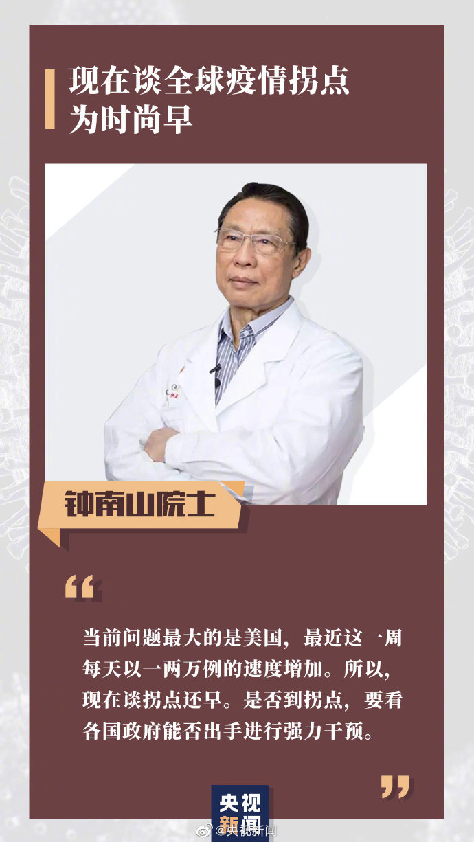鐘南山:從全球看,原來疫情的“震中”在歐洲,特別是西班牙和意大利,現(xiàn)在還包括德國、法國和英國。當(dāng)前問題最大的是美國,最近一周,美國的確診病例數(shù)字在以每天1至2萬的速度增加,目前預(yù)測全球疫情何時(shí)出現(xiàn)“拐點(diǎn)”為時(shí)尚早。可以說,能否出現(xiàn)“拐點(diǎn)”,主要要看各國政府能不能出手進(jìn)行強(qiáng)力干預(yù)。其他國家有很多不可測的因素,按照目前這個形勢發(fā)展下去,恐怕還需要兩周。