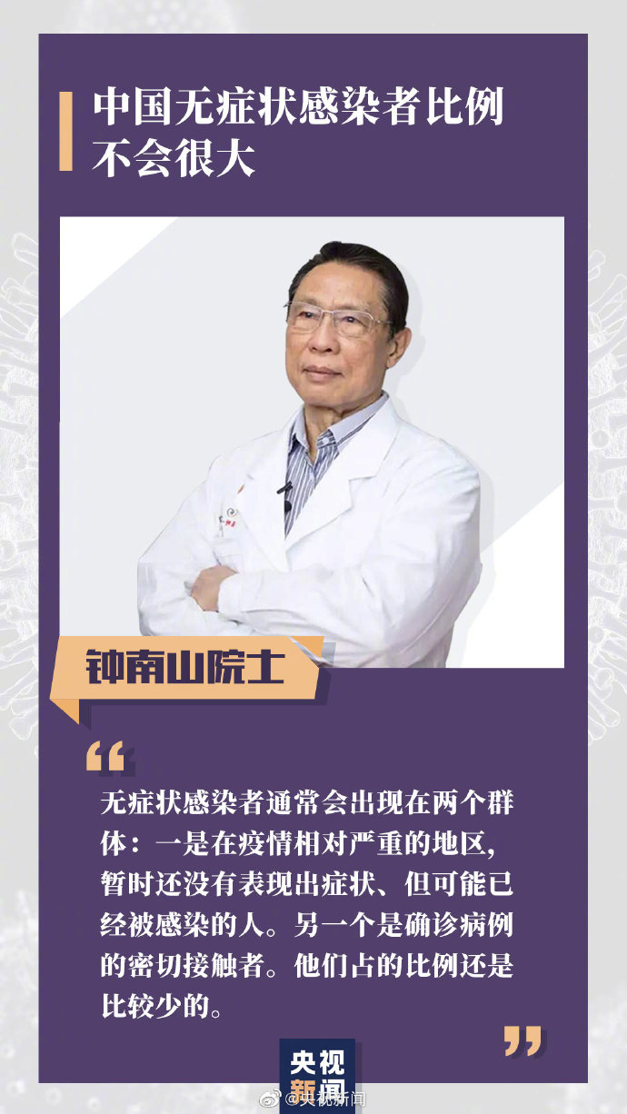 鐘南山:無癥狀感染者不會憑空產(chǎn)生,通常會出現(xiàn)在兩個群體:一是在疫情相對嚴(yán)重的地區(qū),暫時(shí)還沒有表現(xiàn)出癥狀、但可能已經(jīng)被感染的人;另一個是確診病例的密切接觸者,他們所占比例比較小。無癥狀感染者也有兩個概念,一類是開始沒有癥狀,但后來會逐漸發(fā)展到有癥狀,這類患者肯定具有傳染性;另一類是在相當(dāng)長的觀察過程中,始終沒有癥狀,但核酸檢測呈陽性。這類患者的傳染性,我們正在研究。但根據(jù)新冠病毒的特性,一旦出現(xiàn)癥狀,傳染性就比較強(qiáng),所以將無癥狀感染者進(jìn)行隔離觀察是正確的。