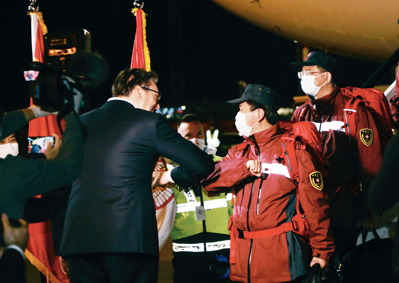 2020年3月21日,在塞爾維亞首都貝爾格萊德,前來迎接的塞爾維亞總統(tǒng)武契奇(左)與中國援助塞爾維亞抗疫醫(yī)療專家組成員“碰肘”致意。6名中國專家當天抵達貝爾格萊德,一批由中國政府捐贈的醫(yī)療物資也同機抵達。 新華社記者 石中玉/攝