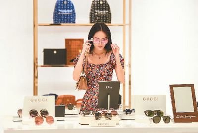 近日,海南三亞國際免稅城在海南三亞市增開了兩家免稅體驗店。顧客可在免稅體驗店內(nèi)體驗商品后,在網(wǎng)上下單購買。圖為一名顧客在新開于三亞紅樹林度假酒店內(nèi)的免稅體驗店體驗商品。