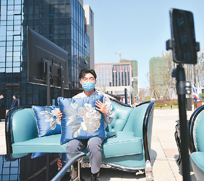 在江西省贛州市南康區(qū)跨境電商產(chǎn)業(yè)園,銷售員工通過手機直播的形式推銷家具。