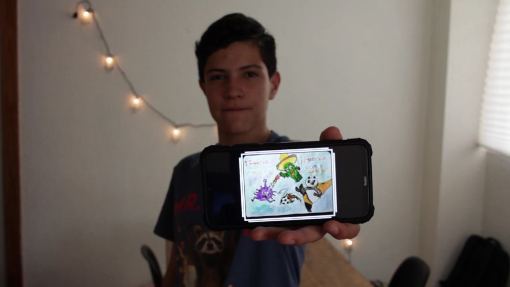 14歲的墨西哥男孩埃米利奧在收到郵件后,將中國小朋友的畫存到了自己的手機(jī)中。(視頻截圖)