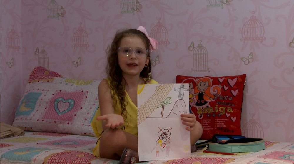 8歲巴西女孩皮埃特拉2月曾繪制一張為中國加油的畫作。(視頻截圖)
