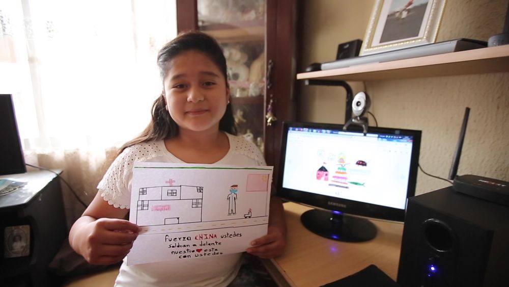 10歲厄瓜多爾女孩艾琳將她與中國女孩為對方國家祝福的畫作擺放在一起。(視頻截圖)