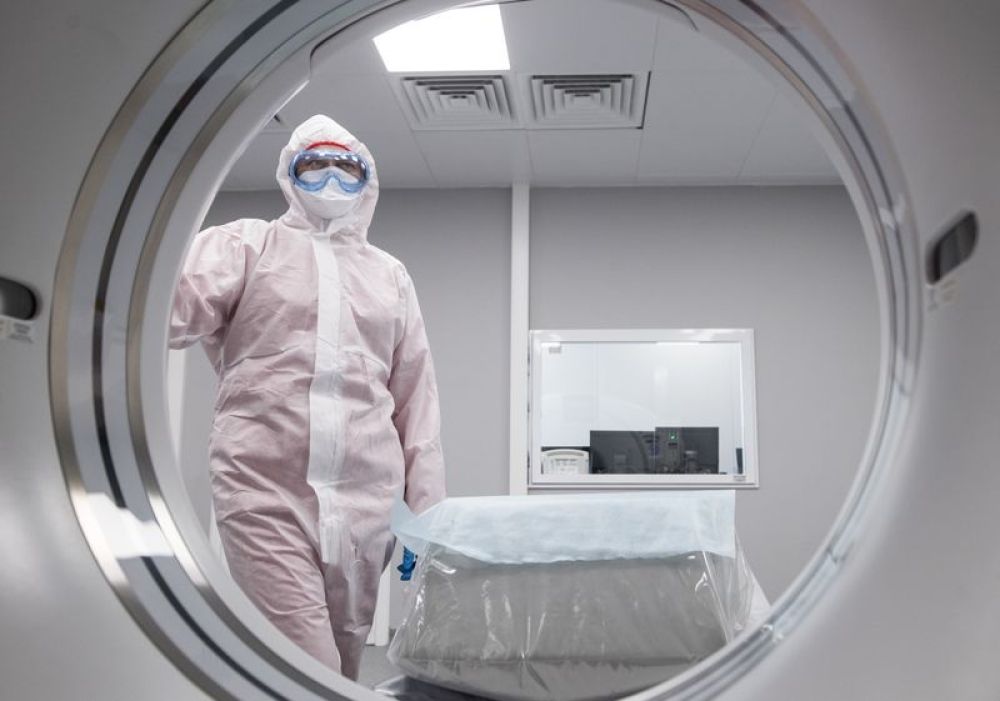 4月23日,醫(yī)護(hù)人員在俄羅斯首都莫斯科市郊新建成的傳染病醫(yī)院內(nèi)工作。(新華社/衛(wèi)星社)