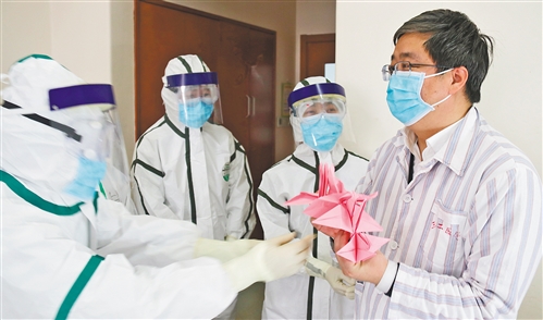 解放軍總醫(yī)院第五醫(yī)學(xué)中心感染病醫(yī)學(xué)部的醫(yī)護人員為患者送上親手制作的千紙鶴。 戴 欣攝