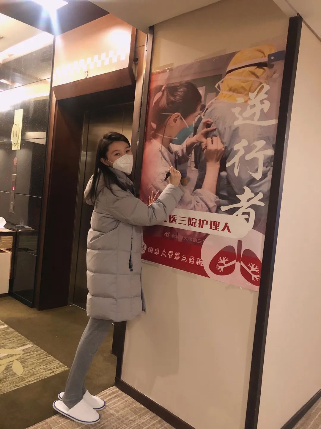 北京大學第三醫(yī)院危重醫(yī)學科護士張佳男在武漢駐地與張貼的海報合影(2月16日攝)。海報照片拍攝于1月29日凌晨三點,張佳男和隊員們進入華中科技大學同濟醫(yī)院中法新城院區(qū)隔離病房第一晚,當時張佳男正在給隊友的防護服上寫字。新華社發(fā)