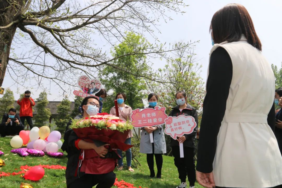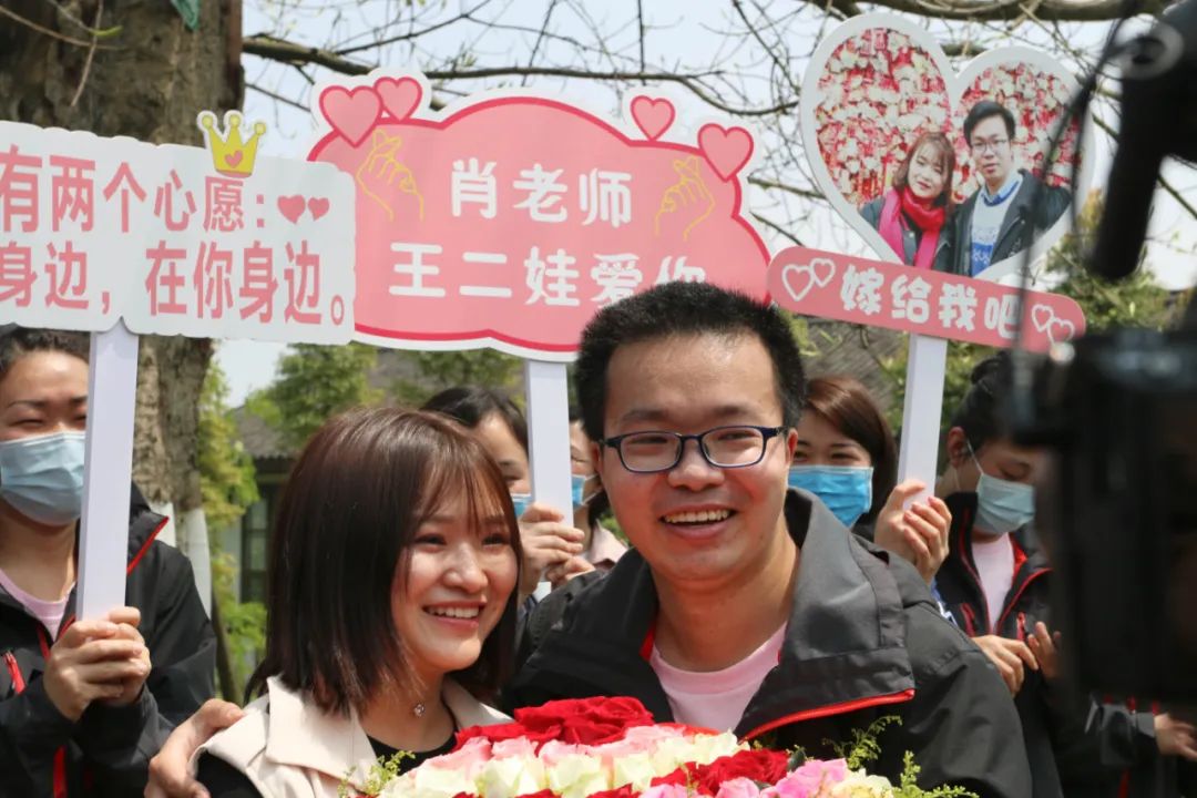 成都醫(yī)學院第一附屬醫(yī)院重癥醫(yī)學科男護士、四川省第三批援湖北醫(yī)療隊隊員王旭濤返回四川隔離期滿后第一時間向護士女友肖雪梅求婚(4月14日攝)。新華社發(fā)