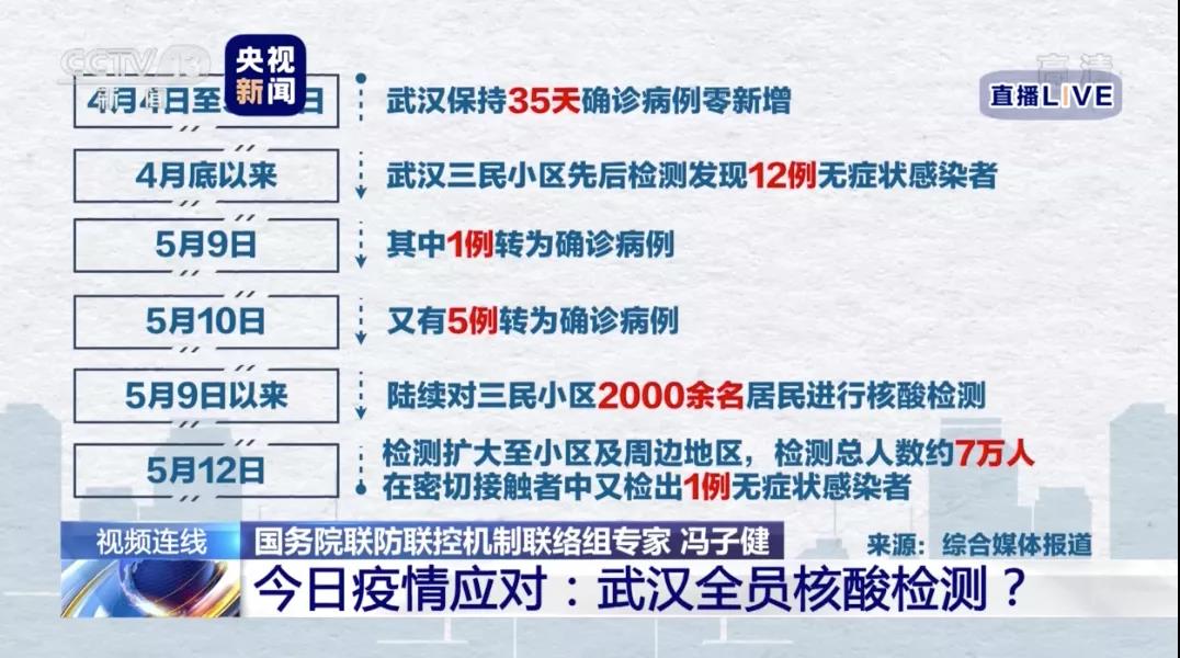 1.武漢進行全員核酸檢測,聯(lián)絡(luò)組對此有何評估?馮子。3月8日,武漢實現(xiàn)確診病例零新增后,醫(yī)療機構(gòu)一直在擴大核酸檢測的范圍。這段時間以來,每天都有呈陽性的檢測者,他們是無癥狀感染者。近期,武漢又發(fā)生了一起聚集性疫情,這表明武漢前期的病毒傳播并沒有被完全阻斷。武漢市采取全員核酸檢測的措施是積極的行動,對社會動員力度非常大。