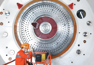 圖為3月18日,工人在位于河南省鄭州市的中鐵工程裝備集團盾構(gòu)機總裝車間作業(yè)。