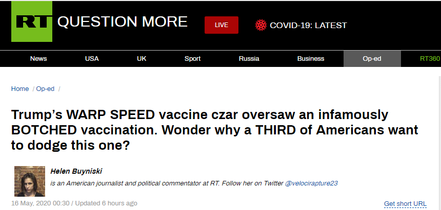 當(dāng)前美國新冠肺炎疫情嚴(yán)重,美國約翰斯·霍普金斯大學(xué)發(fā)布的統(tǒng)計(jì)數(shù)據(jù)顯示,截至北京時(shí)間16日13點(diǎn)32分,美國累計(jì)新冠肺炎確診病例增至1443397例,死亡病例增至87568例。疫苗研發(fā)對新冠疫情防控至關(guān)重要,是戰(zhàn)勝疫情的關(guān)鍵。不過,今日俄羅斯電視臺(tái)網(wǎng)站16日卻報(bào)道稱,美國政府催促多部門和醫(yī)藥公司加速疫苗研發(fā)。在這樣的情況下,美國一些公司研制的疫苗,跳過動(dòng)物實(shí)驗(yàn),直接進(jìn)行人體臨床試驗(yàn),其安全性引發(fā)質(zhì)疑。