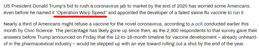通常情況下,如果一切順利,疫苗研發(fā)需要12至18個(gè)月時(shí)間。但特朗普希望加快這一進(jìn)度,并表示,“曲速行動(dòng)”意味著規(guī)模大而速度快,期待今年年底前研發(fā)出新冠疫苗。