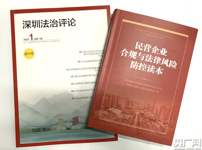《深圳法治評(píng)論》創(chuàng)刊號(hào)、《民營(yíng)企業(yè)合規(guī)與法律風(fēng)險(xiǎn)防控讀本》(中央廣播電視總臺(tái)央廣記者 黃倩 攝)
