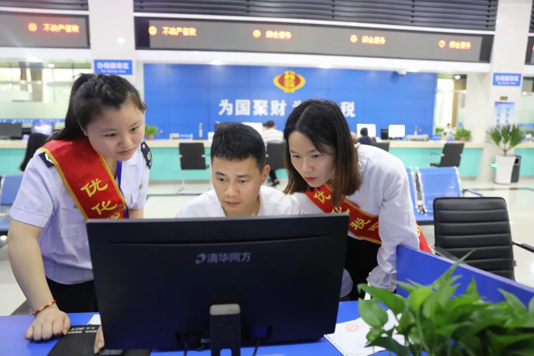 圖為共青城稅務(wù)局辦稅服務(wù)廳,稅務(wù)干部為前來(lái)辦稅的江西航師信息科技有限公司的法定代表人蘇明波進(jìn)行“一對(duì)一”納稅申報(bào)業(yè)務(wù)輔導(dǎo),助力大學(xué)生創(chuàng)新創(chuàng)業(yè)。