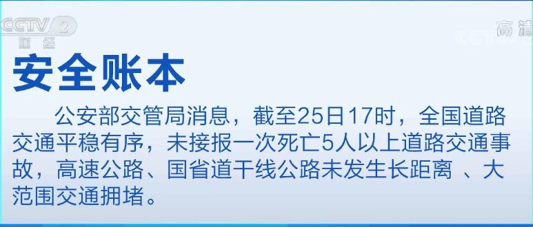 再來看安全賬本。公安部交管局消息,截至25日17時,全國道路交通平穩(wěn)有序,未接報一次死亡5人以上道路交通事故,高速公路、國省道干線公路未發(fā)生長距離、大范圍交通擁堵。公安部交管局同時發(fā)出提醒,駕車出行要提前了解沿途天氣和道路情況,雨天行車特別是在高速公路駕車要做到“降速、控距、亮尾”,遇道路擁堵依次排隊通行,嚴禁爭道搶行或占用應急車道。假期出游,合理安排行車時間和路線,全程系好安全帶,注意勞逸結合,切勿疲勞駕駛,切勿酒后駕車。