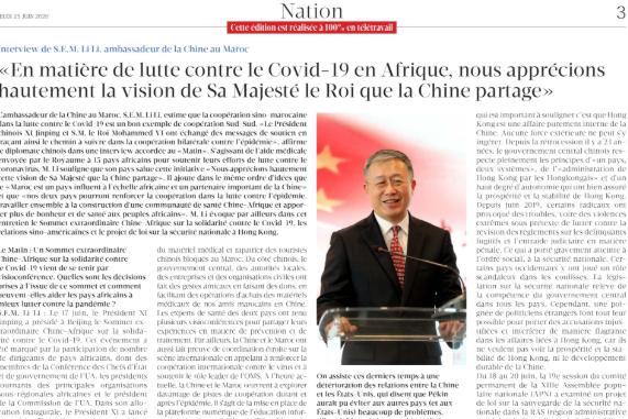 中國駐摩洛哥大使李立當(dāng)?shù)貢r間24日就中非團結(jié)抗疫特別峰會、中摩抗疫合作、北京新發(fā)疫情、中美關(guān)系以及疫后經(jīng)濟形勢接受了摩洛哥發(fā)行量最大的法文報紙《晨報》專訪。李大使在采訪中表示,中非團結(jié)抗疫特別峰會是在中非雙方抗擊新冠肺炎疫情的重要時刻召開的一次重要會議,與會中非領(lǐng)導(dǎo)人就深入推進中非抗疫合作達(dá)成重要共識,充分體現(xiàn)了中非雙方?jīng)Q心深化中非友好,加強相互支持,著力構(gòu)建更加緊密的中非命運共同體的決心。