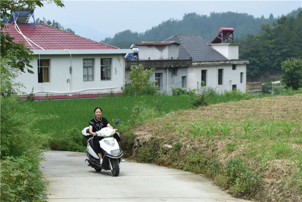 在安徽省岳西縣來榜鎮(zhèn)公山村,汪鏈騎車出行工作(6月24日攝)。新華社記者 周牧 攝