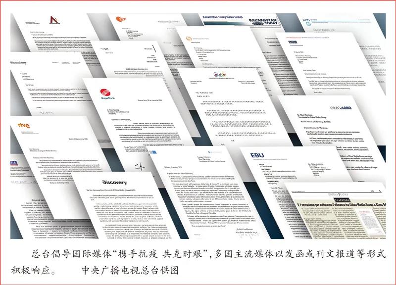 攜手抗疫、共克時(shí)艱,向國(guó)際同行發(fā)出中國(guó)媒體最強(qiáng)音。疫情發(fā)生后,習(xí)近平總書記與各國(guó)元首、各國(guó)際組織負(fù)責(zé)人等頻密溝通、深化共識(shí),以務(wù)實(shí)高效的方式有力推動(dòng)國(guó)際合作。我們緊緊跟隨習(xí)近平總書記外交步伐,積極探索創(chuàng)新媒體公共外交方式方法,以文會(huì)友、主動(dòng)作為,投桃報(bào)李、廣結(jié)善緣。1月底至3月初,總臺(tái)先后收到104家國(guó)際主流媒體和全球5家主要媒體組織負(fù)責(zé)人的慰問信,總臺(tái)負(fù)責(zé)人逐一復(fù)函致謝,并倡導(dǎo)國(guó)際媒體同行及時(shí)、客觀、全面地報(bào)道中國(guó)的疫情形勢(shì)及中國(guó)抗疫的巨大努力和積極成效。隨著疫情在境外擴(kuò)散蔓延,3月上旬至6月底,總臺(tái)向112家國(guó)際媒體機(jī)構(gòu)負(fù)責(zé)人和32個(gè)國(guó)家駐華大使發(fā)去慰問函,介紹中國(guó)政府積極開展抗疫國(guó)際合作的立場(chǎng)和行動(dòng),呼吁國(guó)際媒體加強(qiáng)合作、同向發(fā)力,為戰(zhàn)勝疫情做出負(fù)責(zé)任媒體應(yīng)有的努力和貢獻(xiàn)。路透社、法新社、全俄廣播電視公司、英國(guó)廣播公司、韓國(guó)放送公社、日本廣播協(xié)會(huì)等媒體同行紛紛以發(fā)函或刊文報(bào)道等形式積極回應(yīng),肯定中國(guó)在抗擊疫情中的國(guó)際合作和大國(guó)擔(dān)當(dāng),贊賞總臺(tái)作為國(guó)際主流媒體的責(zé)任和作用,并表示愿意以此為契機(jī)與總臺(tái)加強(qiáng)包括抗疫報(bào)道在內(nèi)的多領(lǐng)域合作。