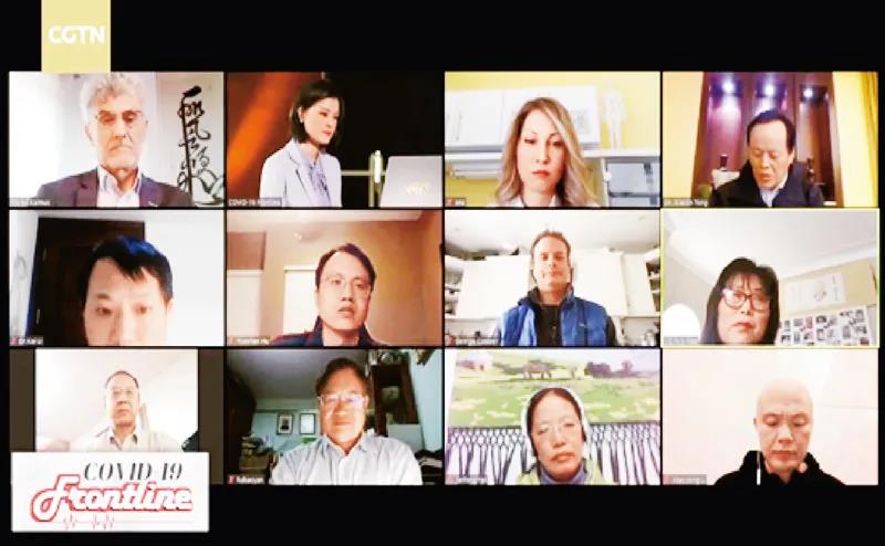 △總臺(tái)節(jié)目《全球疫情會(huì)診室》通過視頻連線向各國(guó)專家介紹中國(guó)一線醫(yī)護(hù)人員抗疫寶貴經(jīng)驗(yàn)。(中央廣播電視總臺(tái) 供圖)